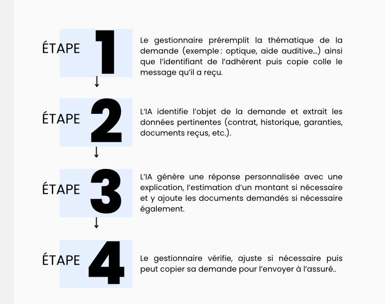 Certaines mutuelles vont plus loin en intégrant des assistants IA directement dans les outils métiers des gestionnaires. Kanbios a accompagné une mutuelle traditionnelle dans le déploiement d’un LLM connecté à son outil gestionnaire afin d’améliorer le temps de traitement des centres de service. Ce type de solution permet de gagner environ 45% de temps sur les demandes traitées (Observatoire Tech Santé, 2024) et améliore l’expérience adhérent ainsi que la qualité des réponses. Ci-après le parcours détaillé :