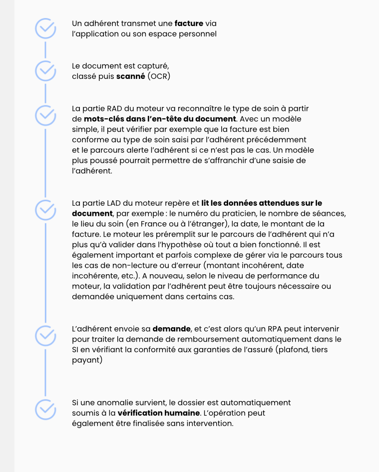 Intégrer la LAD/RAD dans les parcours de remboursement permet d’automatiser l’ensemble de la chaîne : de la réception de la facture à l’intégration dans le système de gestion, jusqu’au déclenchement du remboursement via des outils de RPA. Kanbios a pu mettre en place ce cas d’usage chez l’un de ses clients. Cela a permis de simplifier le parcours de l’adhérent tout en permettant aux équipes internes de se concentrer sur les dossiers à forte valeur ajoutée ou nécessitant une expertise humaine. Ci-après le parcours de l’adhérent :